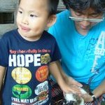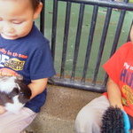 モルモットを抱っこしてうれしい凪とややこわごわの空。でも、この後、ブラッシングなどしてあげてました。