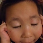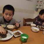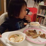 骨付きの魚を初めて自分たちで食べてます。今日はカレイの唐揚げ。おいしかったね♪