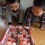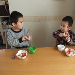 どちらの皿のイチゴが大きい、とか、どちらの皿にいくつ残ってる、とか牽制し合ってます。早く食べなさーい!