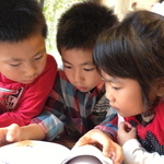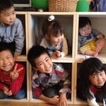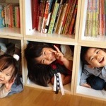 本とオモチャ箱の整理のために空けたはずのスペースに、なぜかすっぽり収納される子供たち。