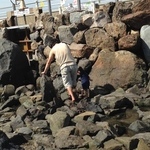すっかり潮が引いた岩場を散策。カニさんいるかな〜♪