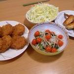 コロッケと手羽先のカレー焼きとサラダとキャベツです。おいしかった♪またよろしくおねがいします!!!