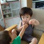 今朝のけんかの仲直りに、みんなでケーキをいただきます♪