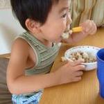 これ以上開かないくらい口開けて納豆をほおばってます。