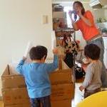 めったに遊べないおもちゃ(大量の発泡スチロール)を前に崩壊してしまった、百木野家のご長男。