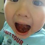 車中はおやつタイム。口の中はチョコでドロドロ。