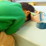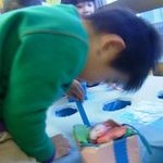 星空を作りましょう、のシールを恐竜の目に貼ってるw ポスターの目に画鋲刺すタイプだね、キミたち。