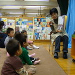 ボランティアのお姉さんが読み聞かせしてくれます。空凪、最前列をGET!