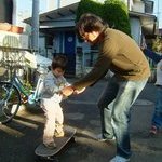 初めてのスケボー。急坂の多い羽沢では見たことないアイテムだね。