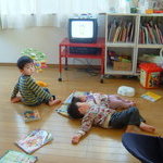 でろーんとテレビ観る2人とシャッター音に気づいちゃった空。