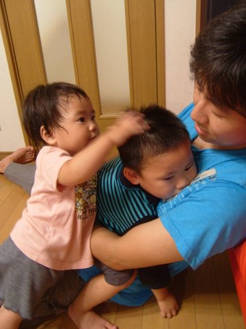 泣いちゃった凪を優しく慰める宝。よしよし。