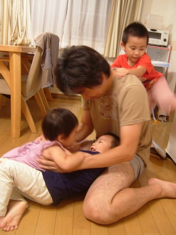 嬉しくなってみんなでお父さんに群がる子供ら。