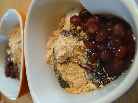 バニラアイスの黒蜜きなこがけ、粒あん添え。がっつりうまし。