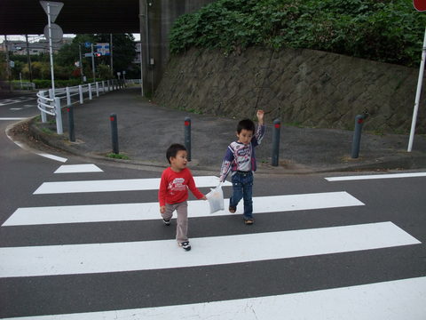 幼稚園で教えてもらったらしくて、ちゃんと手を挙げて渡ります。