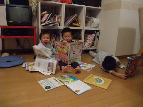 右から。本読んでる。本読んでる。本、おい!破ってるだろっ!