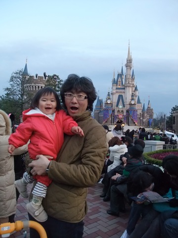 シンデレラ城をバックに。もうパレード待ちの人結構いるけど、寒いので直前まで他のアトラクション回ってくるのだー。