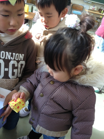 魚はあげられないから、景品は折り紙なんですって。寿は紙風船をもらったよ。