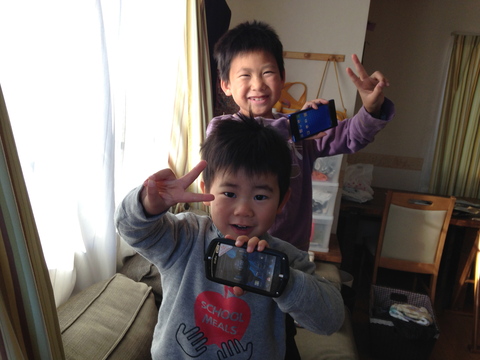 ではなくて、昨日、電器屋さんで古いサンプル携帯をもらってきたのでした。それでもご満悦な子供たち。