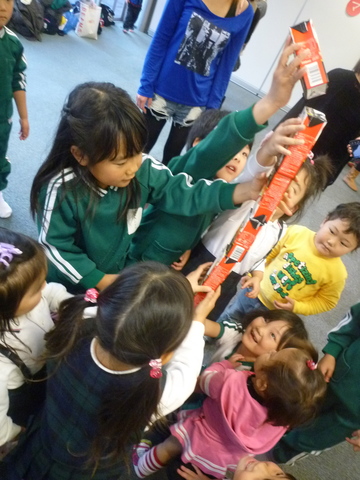 パックのジュースをどれだけ高く積めるか、競争。いやー、それはちょっと無理じゃない?