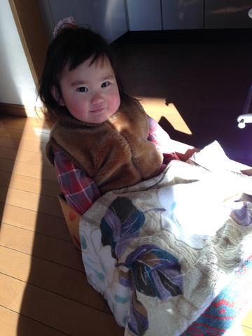 湯たんぽ入れておく段ボール。朝まだ温かい湯たんぽの上に座ってタオルかけて、ひとりコタツのできあがり。うふ♪