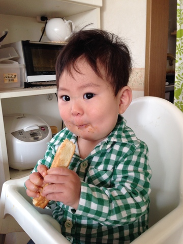いつものバタートーストをピーナッツバターにしたらこの顔。そーかそーか、うまいか。よしよし♪