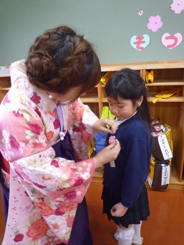 担任の先生に「卒業おめでとう」の花をつけてもらう宝。