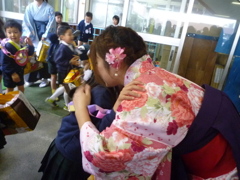 うちの幼稚園では、お帰りのときに毎日先生にハグして両手タッチして帰ります。生徒として最後のハグ。先生もいつもより力が入ります。
