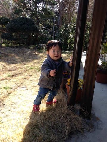 伝って歩いてお散歩中。お外、楽しそうね♪
