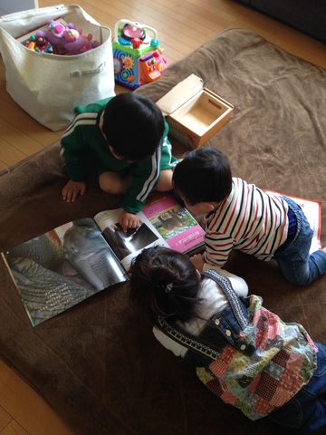 幼稚園で配布される本。上の3人は「これは僕(私)のなんだから、僕(私)が最初!見ないで!」と独占欲むき出しだったんですが、新は帰宅早々「おいでー。ごほんもらってきたよー」と。