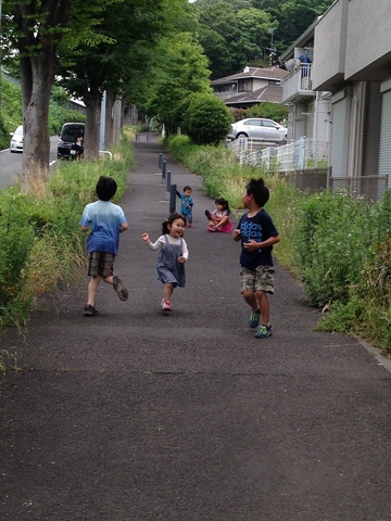 代休の小学生組も一緒に幼稚園バスのお迎えに。バス待ちの間、かけっこ大会が始まりました。
