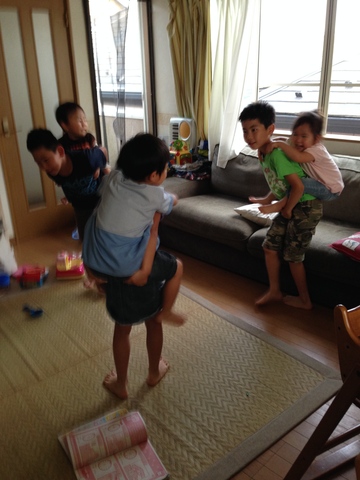突如始まった騎馬戦。上の子を落としたら勝ち、なんだそうです。。え、騎馬戦ってリビングでやる遊び!?