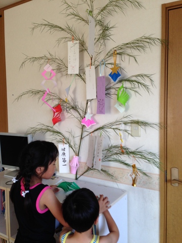 今年も幼稚園から笹をいただいたので、みんなでせっせと短冊や飾りを作っています。