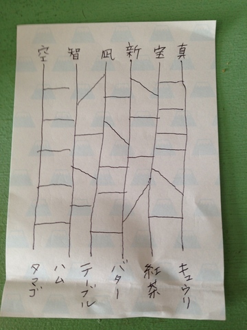 あみだくじはこんな感じでした。テーブル拭く係になった新はがっかり。次に期待、だね!