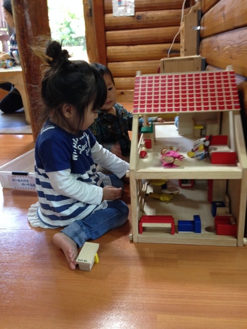 ここ(近くの「ログハウス」という遊び場)に来ると必ずドールハウスの前で数十分動かなくなります。よっぽど好きなんだなぁ。