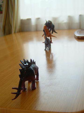 3段重ねになってる恐竜をこっちの紫のやつが「すごいねー」って写真撮ってあげてるところー。