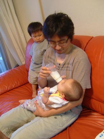 真吾生まれて初めてミルクの授乳。横でジェラシー1000%の目線も感じつつ。