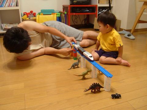 プラレールと恐竜の夢のコラボ。真吾が鋭意制作中。