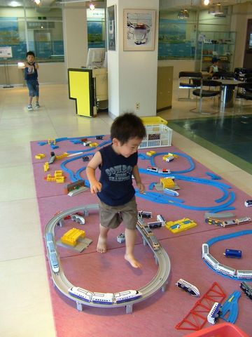 展示の横にはプラレールコーナーがあって、遊び放題!空も大興奮!!
