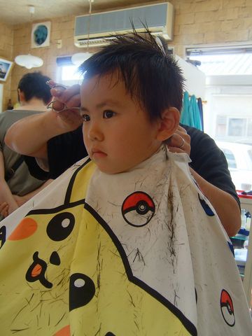 じーじ・ばーばのお友達の床屋さんに連れてこられました。生まれて初めての床屋さんでやや緊張気味。