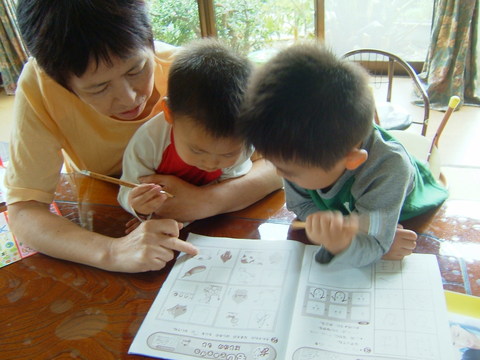「幼稚園」という雑誌の付録でお勉強ごっこ。えんぴつ振り振り真剣です。