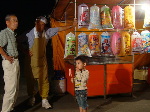 じーじが屋台をやってる知り合いのおじさんと話してるところへ、さりげなく寄っていく空。狙いはもちろん、恐竜キングの綿あめ!