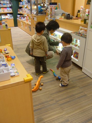 雨がぱらついてきちゃったので、午後はららぽーとへ。おもちゃやのサンプルを遊び倒し・・・