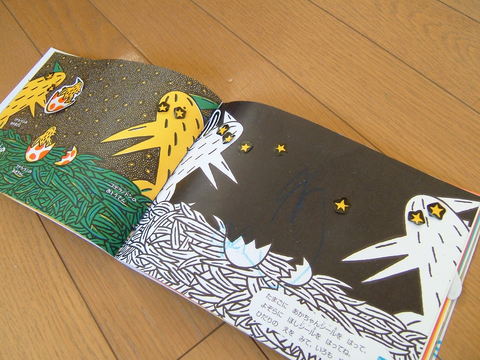 星空を作りましょう、のシールを恐竜の目に貼ってるw ポスターの目に画鋲刺すタイプだね、キミたち。