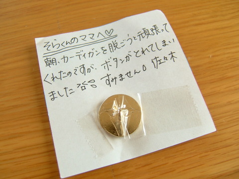 空が自分で着替えようとしてボタン取れてしまったんですって。先生からお手紙つきで返却です。