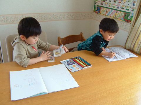 利き手が違うから真ん中に色鉛筆置けて便利。お互いに利き手で取れるんだよ♪