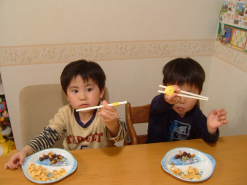ばーばからの荷物に箸も入ってたので、空凪ごいっしょに箸使いの練習です。(ちゃんとした持ち方でつまめたらおやつ食べていい方式)