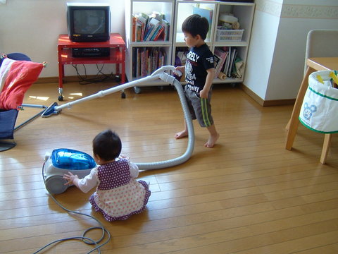 凪は掃除、宝は掃除機をなでなで。