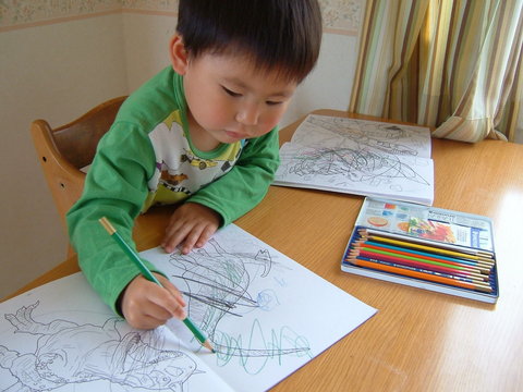 好きな色で好きなように→パラサウロロフスは緑だから緑で塗る、って感じに変わってきました。こんなとこにも成長が見えるね。