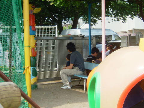 空の乗ってる青バスが来た!というので門に隠れて様子を伺ってます。