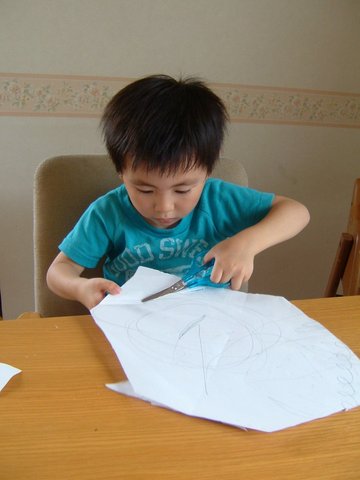 ハサミ苦手意識克服のため、家でもハサミ使わせてみた。やっぱり手が寝ちゃって刃が垂直にならないね。